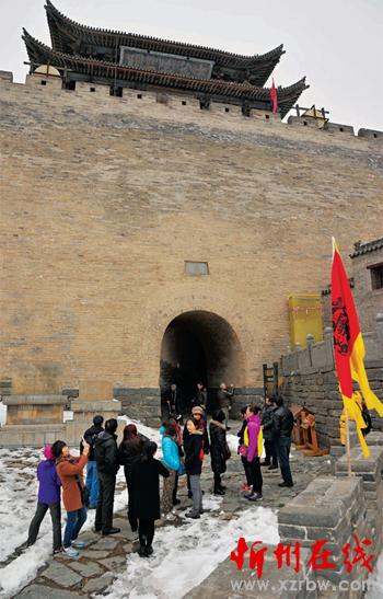 “兩節(jié)”過后的雁門關(guān)景區(qū),一片銀裝素裹讓南來北往的游客沉醉在山舞銀蛇、關(guān)樓雄壯、長城如蟒的北國風(fēng)光之中,體驗(yàn)邊塞生活,抒發(fā)懷古幽情。圖為游客在雁樓前停留。(石俊文 攝)