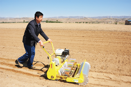 5 月14 日上午,位于繁峙縣金山鋪鄉(xiāng)郝家灣村的海豐農(nóng)場(chǎng)的谷子試驗(yàn)田里,山西農(nóng)業(yè)大學(xué)教授郭平毅正在為村民們演示韓國(guó)產(chǎn)小籽粒播種機(jī)的操作要領(lǐng)。山西農(nóng)業(yè)大學(xué)開展“送技術(shù)下基層”活動(dòng),他們?yōu)楹XS農(nóng)場(chǎng)送來了2 臺(tái)韓國(guó)產(chǎn)小籽粒播種機(jī)。(喬偉 攝)