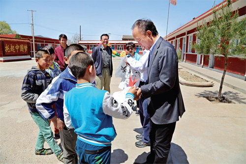 2006 年由省委組織部扶貧工作隊(duì)和省僑辦牽線搭橋,由海外華人創(chuàng)建的欣欣教育基金會(huì)向靜樂(lè)縣康家會(huì)小學(xué)捐贈(zèng)一萬(wàn)美元資助建設(shè)新校舍,新校舍于2006 年8 月份投入使用。5 月17 日,該基金會(huì)副會(huì)長(zhǎng)丁永慶一行深入靜樂(lè)縣,走訪基金會(huì)當(dāng)年捐建的康家會(huì)小學(xué)。圖為基金會(huì)工作人員在和學(xué)生交談,了解學(xué)?,F(xiàn)在存在的問(wèn)題和困難,希望與該校保持長(zhǎng)期固定的聯(lián)系,以便進(jìn)一步的交流和幫助。(閆曉梅 攝)
