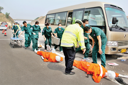 6 月1 日,為了提高對突發(fā)事件的應急處置能力,靈河高速公路神河段建設管理處聯(lián)合偏關縣應急辦、公安消防大隊等有關部門單位成功舉行了群死群傷重特大交通事故應急處置演練。圖為演練現(xiàn)場。(孟建國 攝)