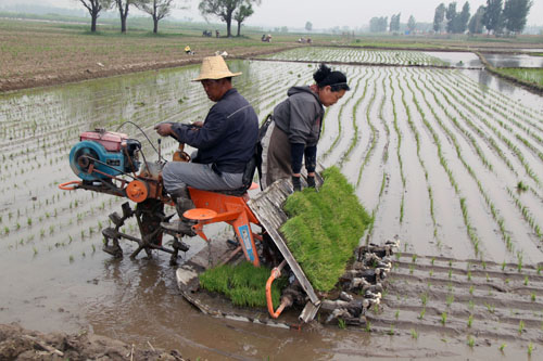 5 月31 日,原平市東營村的稻田里機聲隆隆,一派繁忙景象,農機員正駕駛著鐵牛在插秧。這是該村頭一回用上了現(xiàn)代化的插秧機種植水稻。村民們高興地說:“如今惠農政策就是好,現(xiàn)代農機化作業(yè)為俺農民種田致富插上了金翅膀?!保ㄚw春曉 攝)