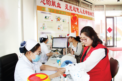 6月14日是“世界獻(xiàn)血者日”,為了感謝獻(xiàn)血者并傳遞獻(xiàn)血者與患者之間的“分享”與“相連”關(guān)系,鼓勵(lì)人們相互關(guān)愛,促進(jìn)社區(qū)團(tuán)結(jié),近日原平市街心廣場(chǎng)愛心獻(xiàn)血屋開展了“‘分享’與‘相連’血液連接你我”主題宣傳活動(dòng)。該市共青團(tuán)市委組織志愿者發(fā)放宣傳圖冊(cè)、開展知識(shí)問答,傳播無償獻(xiàn)血的公益理念,使其更加深入人心。圖為志愿者與市民正在獻(xiàn)血。(褚震 攝)