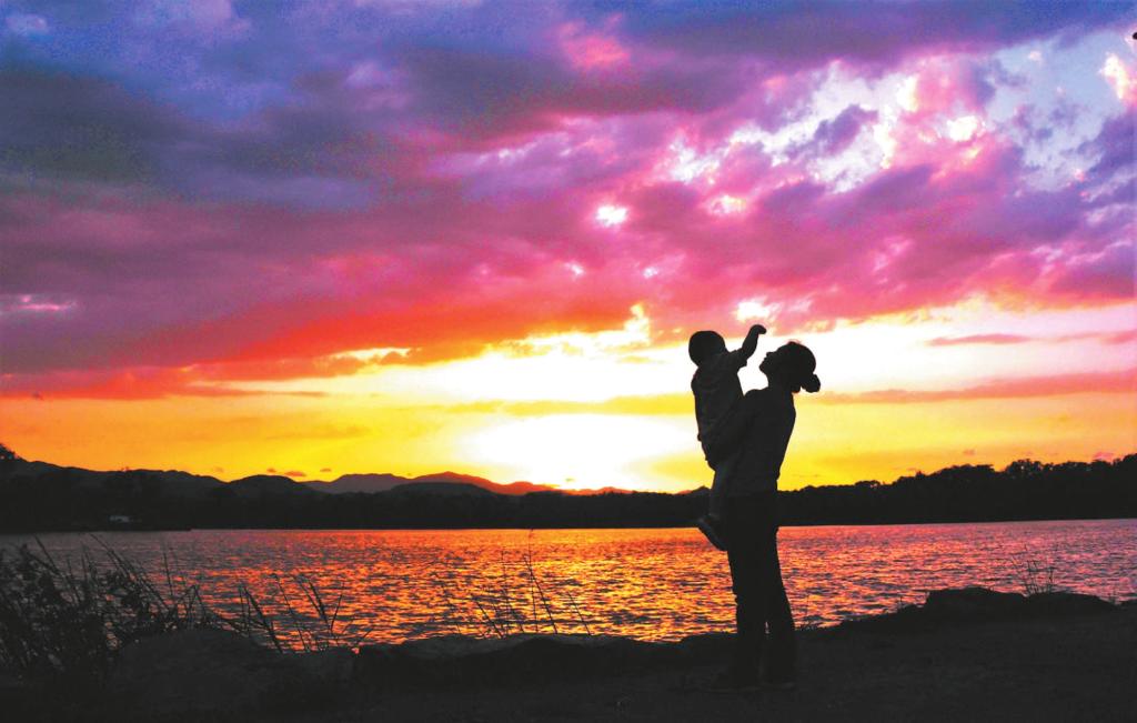 媽媽在晚霞中幸福地哄逗著兒子。梁平攝