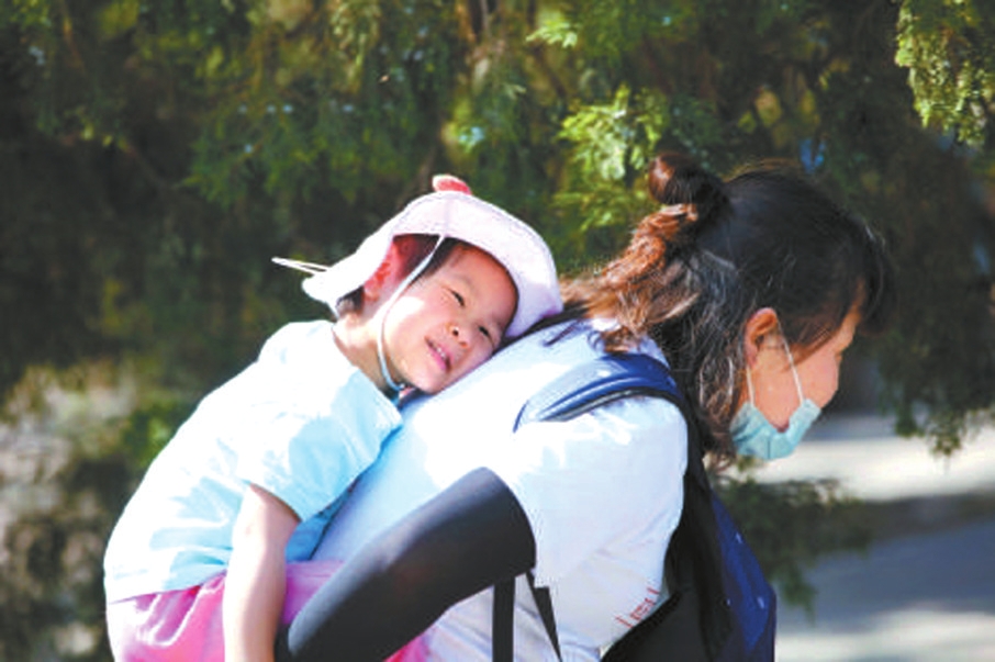 公園里,玩累了的孩子趴在媽媽背上。媽媽的后背是孩子最溫暖的港灣。歐陽明攝