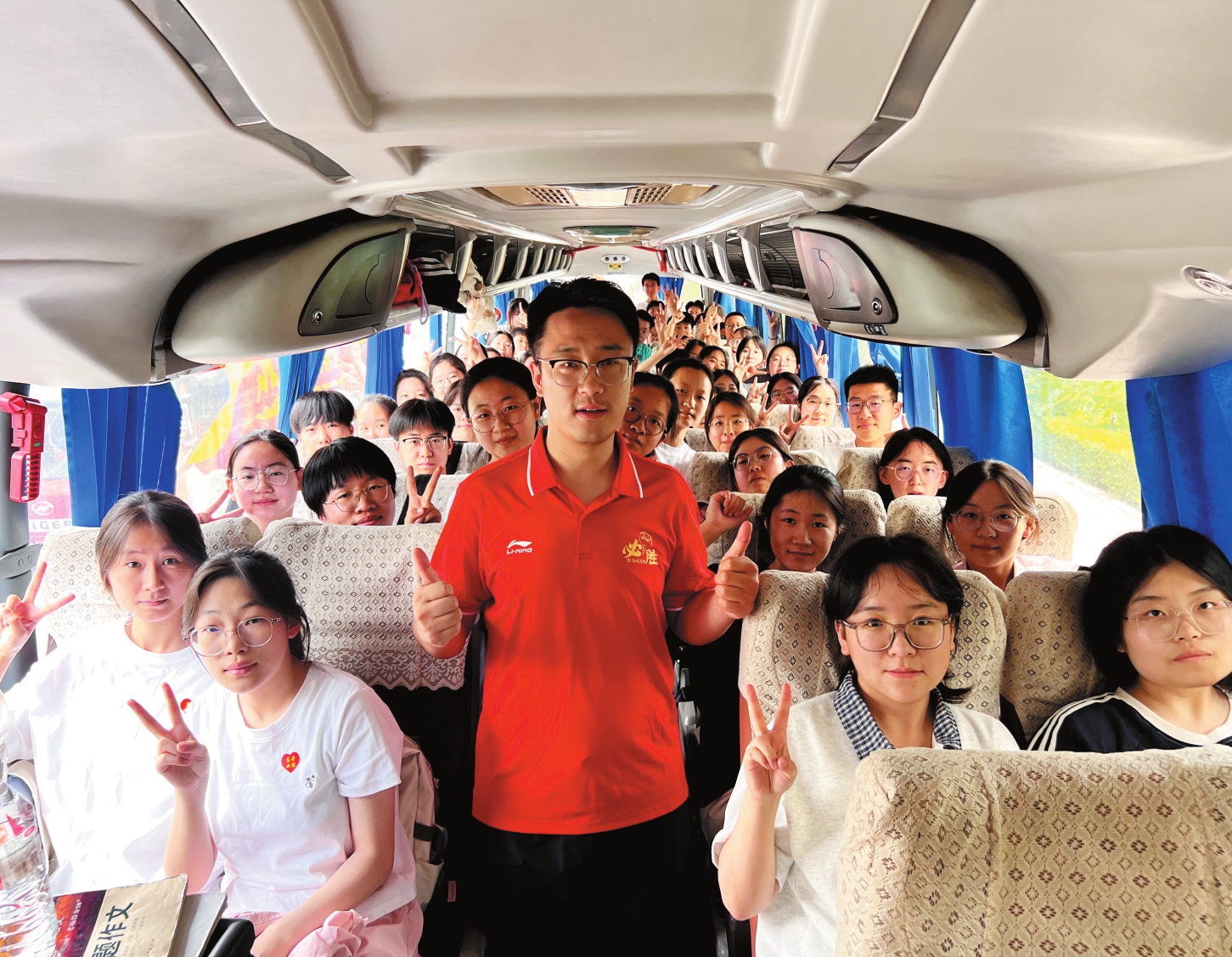 圖為第一場(chǎng)考試結(jié)束后,忻州實(shí)驗(yàn)中學(xué)送考車(chē)上,師生互相鼓勁加油。趙臻宇攝