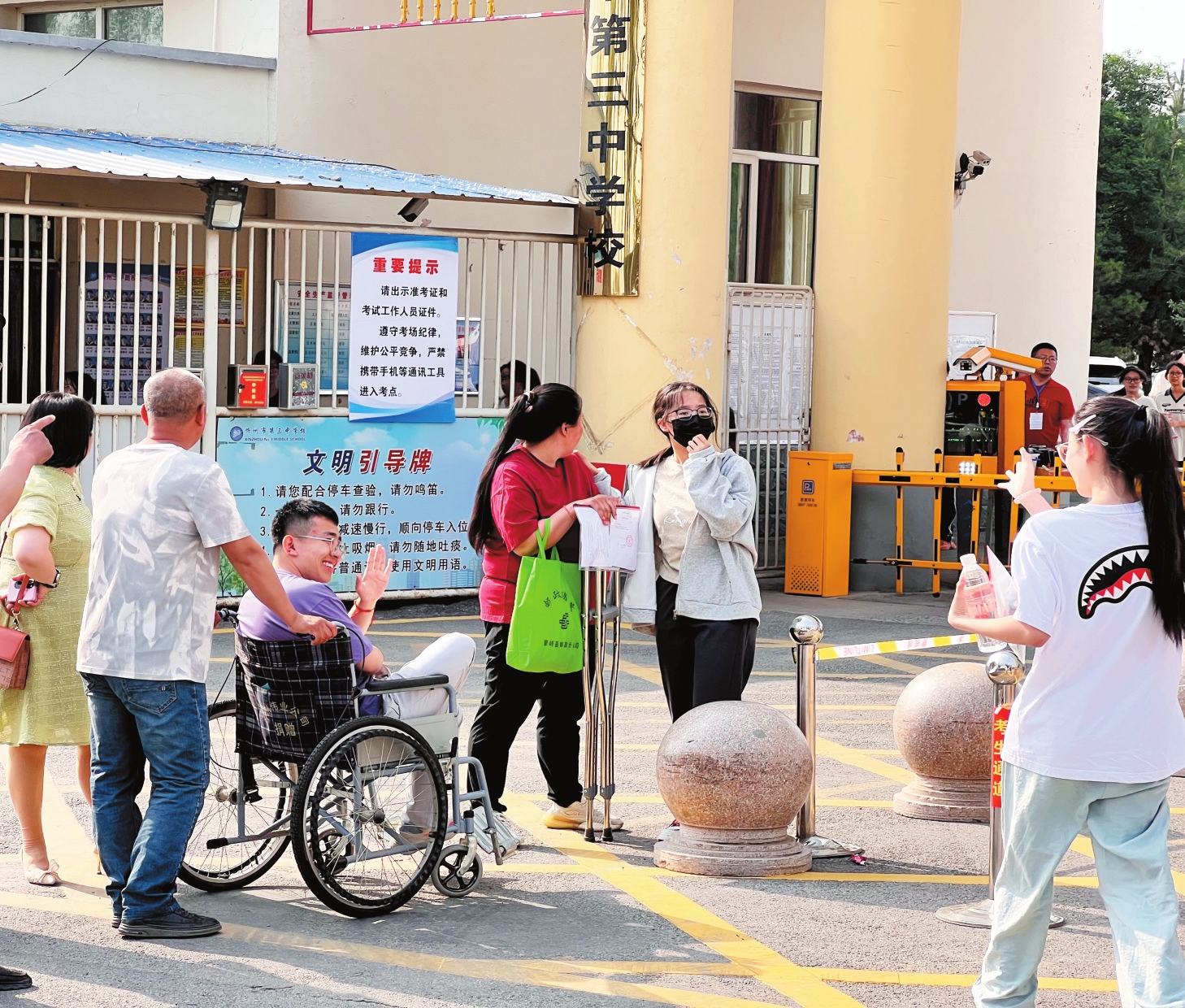 圖為忻州三中考點(diǎn),行走不便的考生在跟同學(xué)打招呼。趙臻宇攝
