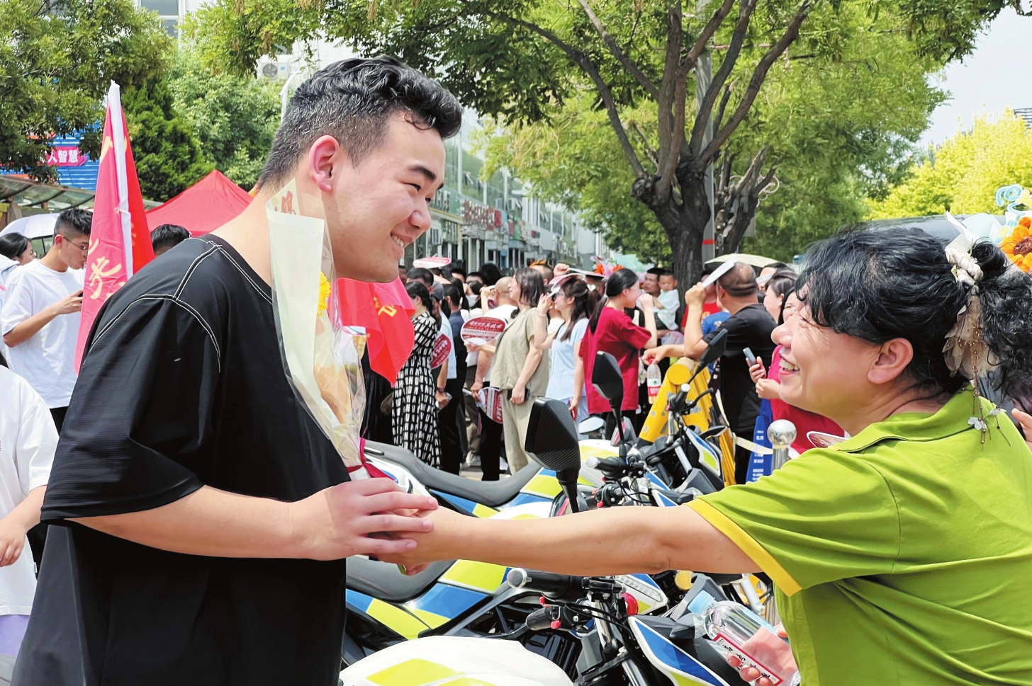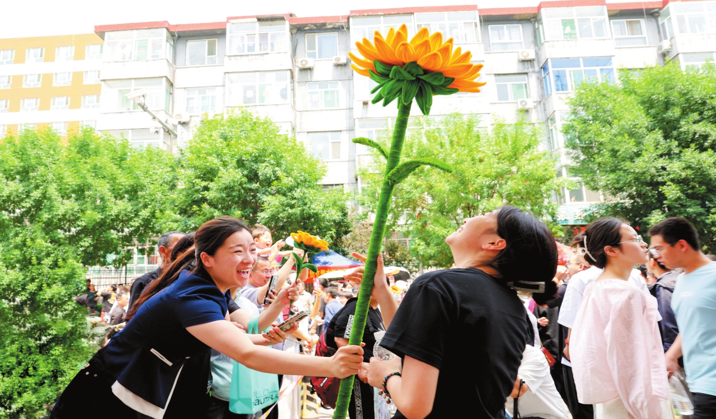 圖為忻州七中考場(chǎng)外,一名考生的姐姐在妹妹走出考場(chǎng)時(shí)送上一朵特大號(hào)向日葵,祝妹妹“一舉奪魁”。范琛攝