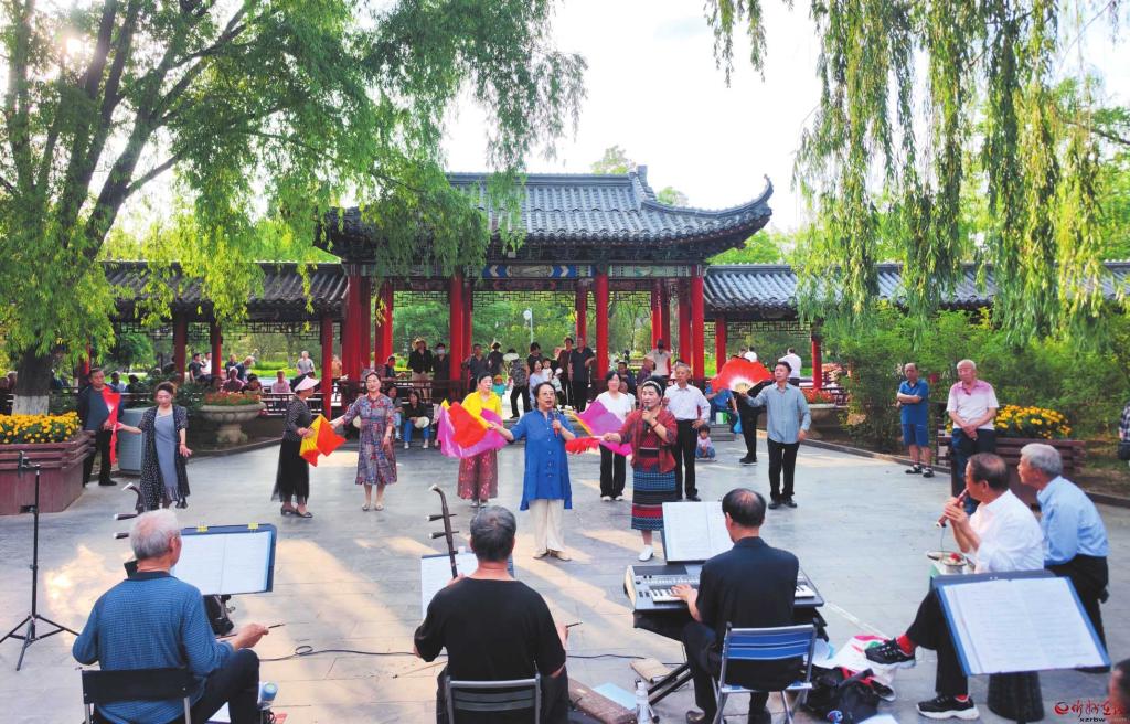 6月9日,在忻州城區(qū)人民公園,老年音樂(lè)愛(ài)好者們正一展歌喉,吸引不少市民圍觀。(記者張存良攝)