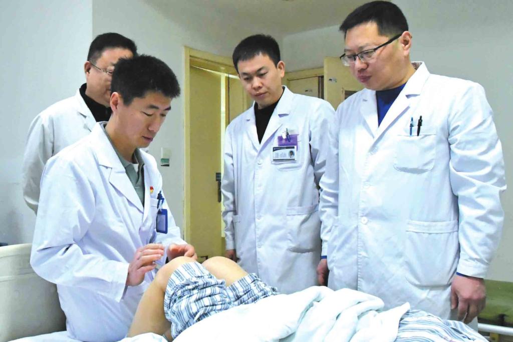 我市與山西醫(yī)科大學第一醫(yī)院簽署合作共建忻州市人民醫(yī)院框架協(xié)議以來,省級專家下沉坐診已成常態(tài)。圖為山西醫(yī)科大學第一醫(yī)院常駐專家、骨科主任韓永斌在市人民醫(yī)院骨科病房查看患者腿部術(shù)后情況。(李潤攝)