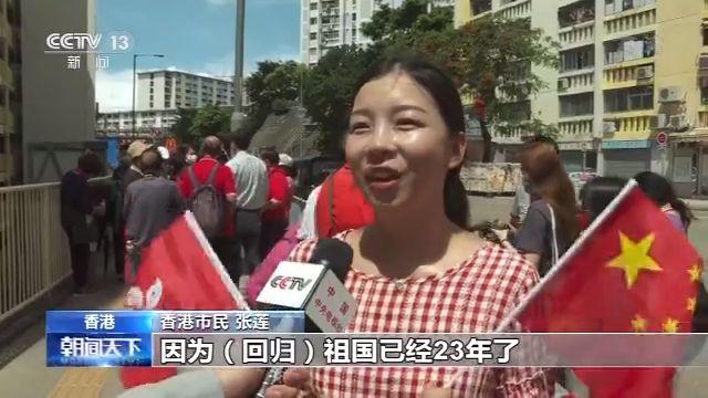 在花車(chē)巡游途中,還可以看到有大批民眾在道路兩旁,手持國(guó)旗和特區(qū)區(qū)旗,熱烈慶祝香港回歸祖國(guó)23周年。