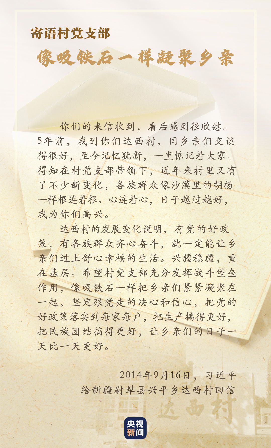 “口袋里要鼓囊囊,精神上要亮堂堂”。2014年4月,習近平在新疆考察時講到了達西村的村訓。村民們懷著激動的心情給總書記寫信,匯報這些年村里的積極變化。當年9月,習近平總書記給沙吾爾·芒力克和全體村民回信,強調興疆穩(wěn)疆,重在基層。