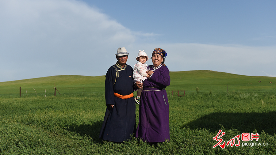 經(jīng)過(guò)60年的洗禮,當(dāng)年的上海孤兒已經(jīng)和這片草原完美的融為了一起。現(xiàn)在的其日麥拉圖,家門口停著汽車,牛舍里裝著監(jiān)控,五畜齊全,人丁興旺,真正過(guò)上了好日子。圖為2020年8月2日,其日麥拉圖夫婦和小孫女在自家牧場(chǎng)。(潘迪攝/光明圖片)