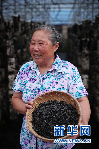 圖為張秀榮在自家木耳種植大棚前展示木耳。新華網(wǎng)記者焦鵬攝
