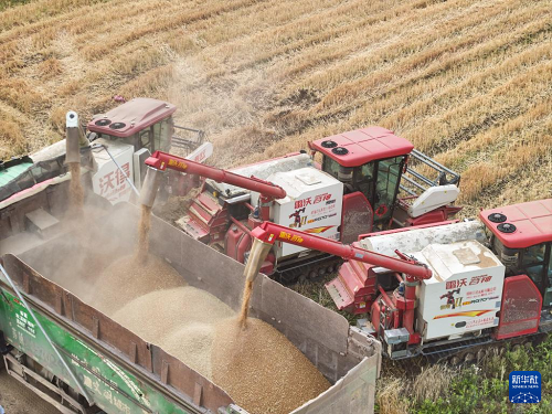 5月27日,在盱眙縣種糧大戶劉凱的承包田,農(nóng)機(jī)手駕駛收割機(jī)搶收小麥。(新華社記者 季春鵬 攝)