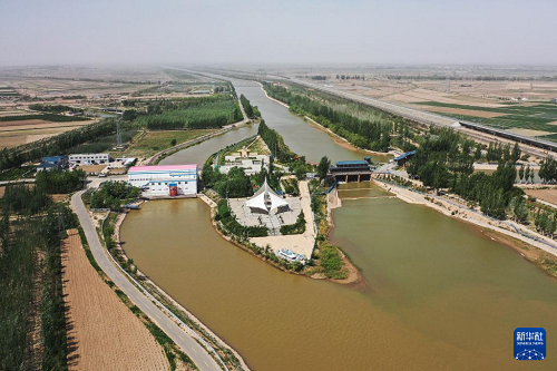 這是5月28日拍攝的巴彥淖爾市臨河區(qū)境內(nèi)的總干渠第二分水樞紐(無(wú)人機(jī)照片)。(新華社記者 李志鵬 攝)