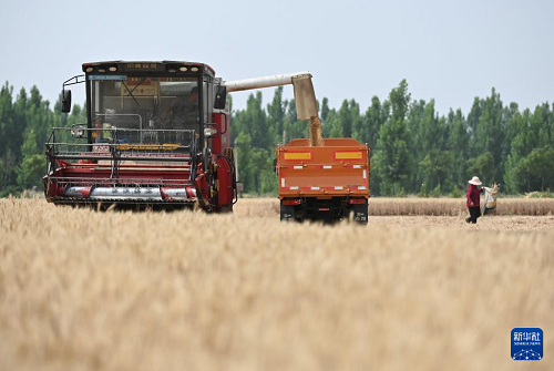 6月2日,農(nóng)機(jī)手在山東省滕州市南沙河鎮(zhèn)河匯村麥田里將小麥裝車。(新華社發(fā) 李志軍 攝)