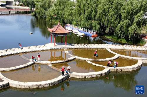 6月3日,環(huán)保志愿者在山東省平邑縣鄭城鎮(zhèn)四合村河壩上撿拾垃圾(無人機照片)。(新華社發(fā) 武紀全 攝)