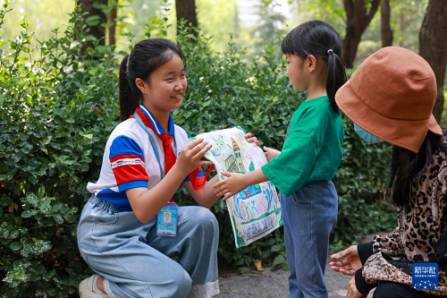 6月3日,山東省棗莊市薛城區(qū)雙語實驗小學在薛城區(qū)城市森林公園開展“手繪環(huán)保袋 傳遞綠色夢”主題活動。這是學生給路人贈送手繪環(huán)保袋。(新華社發(fā) 王龍飛 攝)