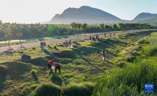 6月4日,河北省遵化市堡子店鎮(zhèn)志愿者在撿拾河道岸邊的垃圾雜物(無人機照片)。(新華社發(fā) 劉滿倉 攝)