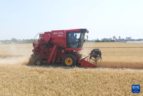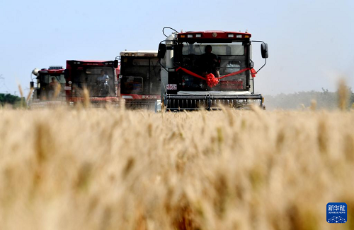 6月10日,聯(lián)合收割機在河北省石家莊市欒城區(qū)柳林屯鄉(xiāng)東牛村麥田里收割。(新華社發(fā) 李明發(fā) 攝)