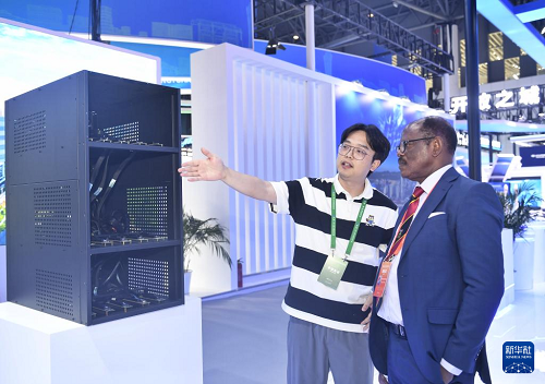 6月11日,參展商在向外賓介紹展出的高性能GPU服務(wù)器。(新華社記者 劉坤 攝)