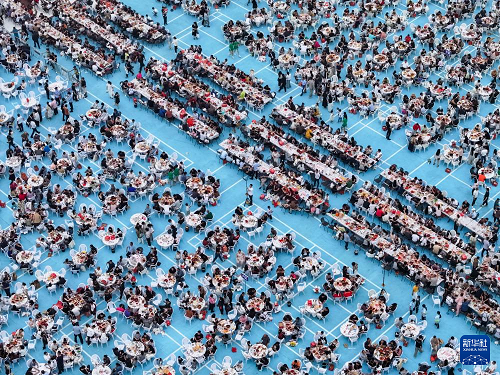 這是第25屆盱眙龍蝦節(jié)歡樂(lè)龍蝦宴現(xiàn)場(chǎng)(6月12日攝,無(wú)人機(jī)照片)。(新華社記者 李博 攝)