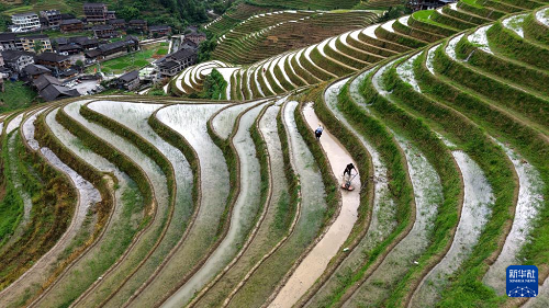 6月12日,廣西桂林龍勝各族自治縣龍脊鎮(zhèn)大寨村村民在梯田上勞作(無人機(jī)拍攝)。(新華社發(fā) 潘志祥 攝)