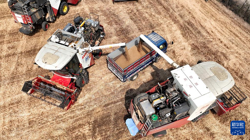 6月12日,收割機(jī)在河北省邢臺市隆堯縣雙碑鄉(xiāng)西良村麥田里將收獲的小麥裝車(無人機(jī)照片)。(新華社記者 牟宇 攝)