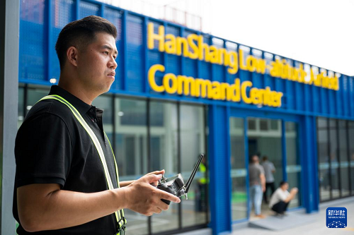 6月16日,在漢商低空港停機(jī)坪,一名工作人員在操控?zé)o人機(jī)起飛。(新華社記者 伍志尊 攝)
