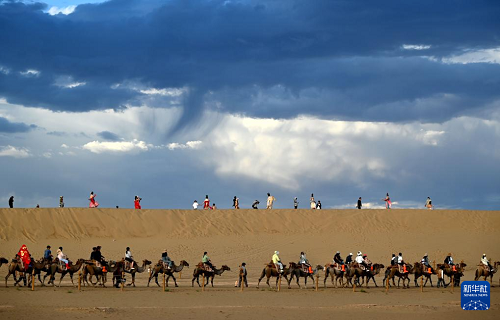 6月21日,游客在甘肅省敦煌市鳴沙山月牙泉景區(qū)騎駱駝游覽。新華社發(fā)( 張曉亮 攝)
