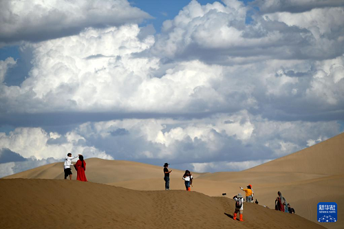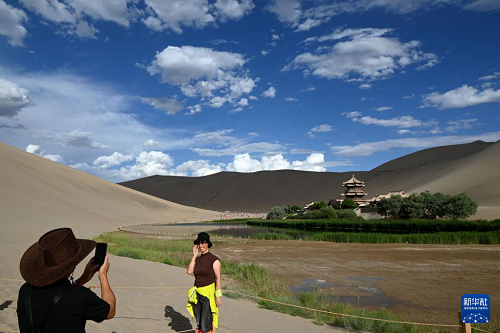 6月21日,游客在甘肅省敦煌市鳴沙山月牙泉景區(qū)游覽拍照。(新華社發(fā) 張曉亮 攝)