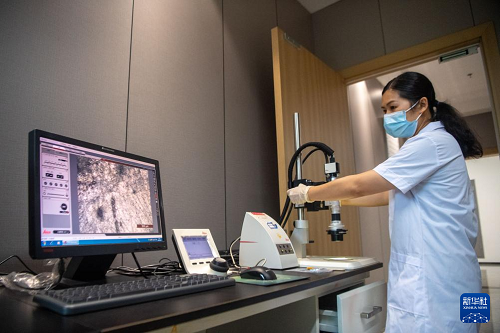 6月24日,在大足石刻文物醫(yī)院,工作人員采集石質文物的數(shù)字化信息。(新華社記者 唐奕 攝)