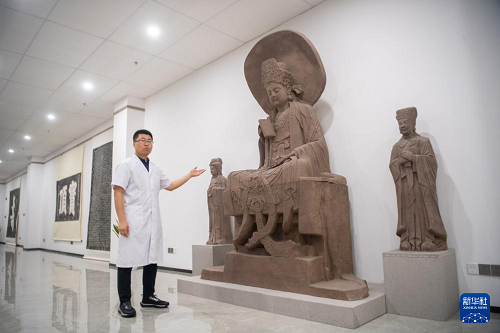 6月24日,在大足石刻文物醫(yī)院,工作人員對石質文物進行修復并采集數(shù)字化信息。(新華社記者 唐奕 攝)