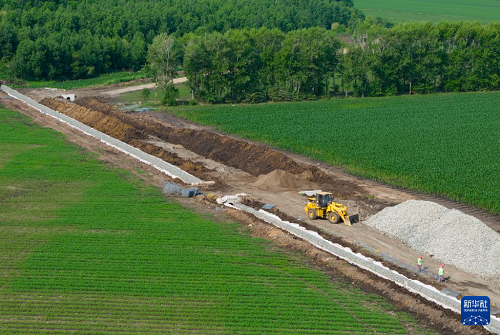 6月23日,北大荒集團北安分公司二龍山農(nóng)場有限公司對排水溝進行護砌施工,構(gòu)建柔性防護結(jié)構(gòu)穩(wěn)定邊坡,減少水土流失,保護黑土地(無人機照片)。(新華社發(fā) 錢泊羽 攝)