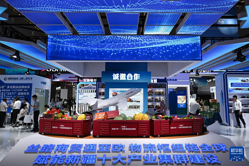 6月26日,在2025(中國)亞歐商品貿(mào)易博覽會現(xiàn)代物流、低空經(jīng)濟(jì)展區(qū),新疆商貿(mào)物流(集團(tuán))有限公司展臺展示多條跨境物流項目。(新華社記者 辛悅衛(wèi) 攝)