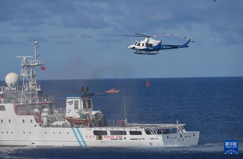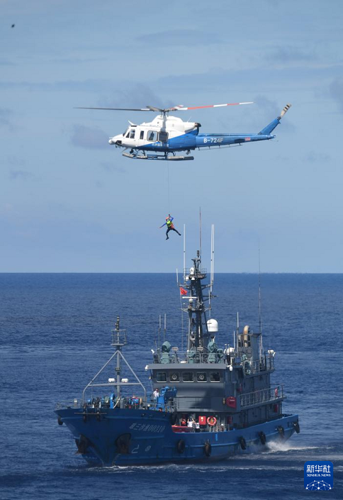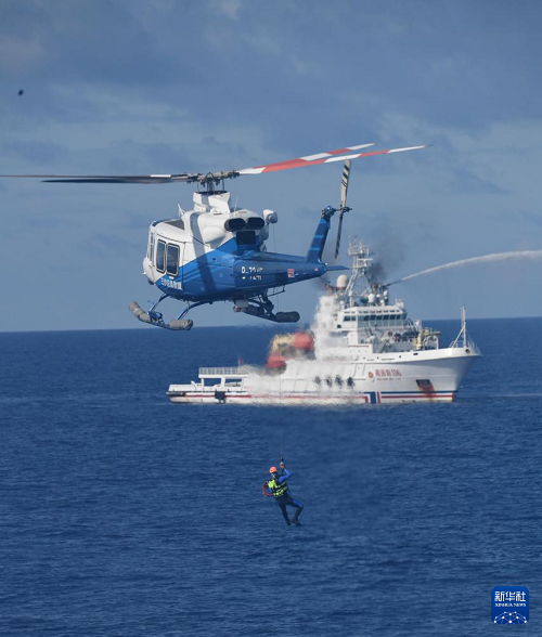 6月26日,救助直升機和船舶在西沙永興島附近海域開展協(xié)同演練。(新華社記者 趙穎全 攝)