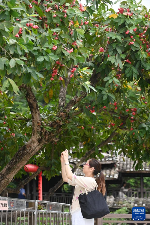 6月29日,在廣西南寧市古城路,市民在拍攝一棵結果的蓮霧樹。(新華社記者 陸波岸 攝)