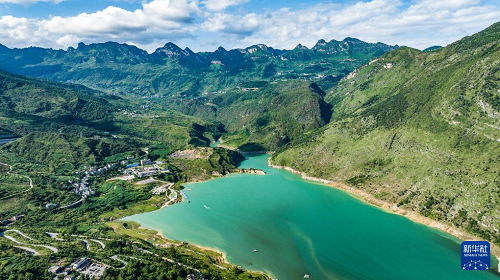 夏日時節(jié),貴州省六盤水市六枝特區(qū)牂牁江風(fēng)景名勝區(qū)草木蒼翠、江水碧藍,青山綠水與道路村莊組成一幅幅美麗畫卷。