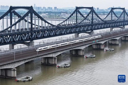 6月30日,一列動車組列車經過武漢天興洲大橋延長線(無人機照片)。(新華社發(fā) 趙軍 攝)