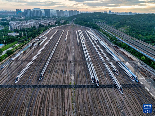 這是6月30日在南京動車段南京南動車運用所拍攝的動車組列車(無人機照片)。(新華社發(fā) 杜懿 攝)