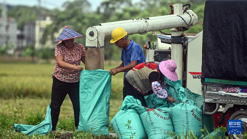 7月2日,廣西欽州市康熙嶺鎮(zhèn)板坪村的村民將收割機(jī)收獲的稻谷裝袋。(新華社記者 張愛(ài)林 攝)