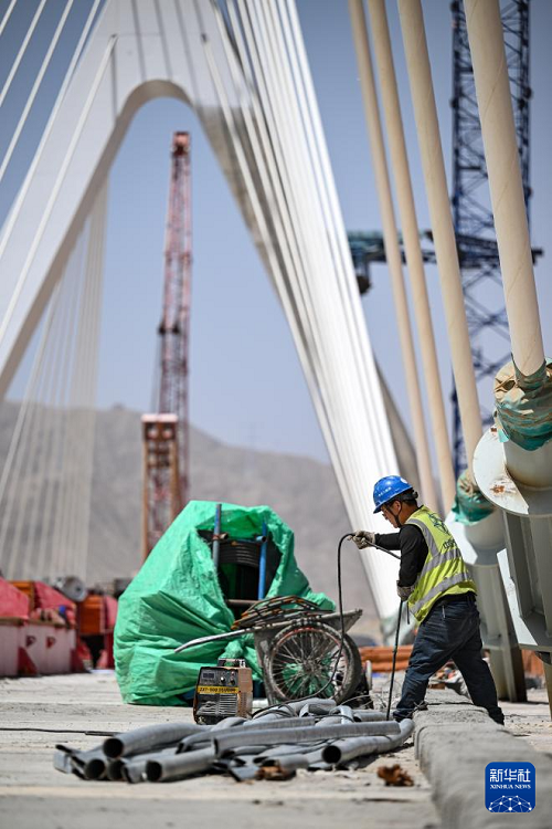 7月3日,工人在黑山峽黃河特大橋建設(shè)現(xiàn)場(chǎng)施工作業(yè)。(新華社記者 馮開華 攝)