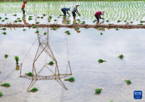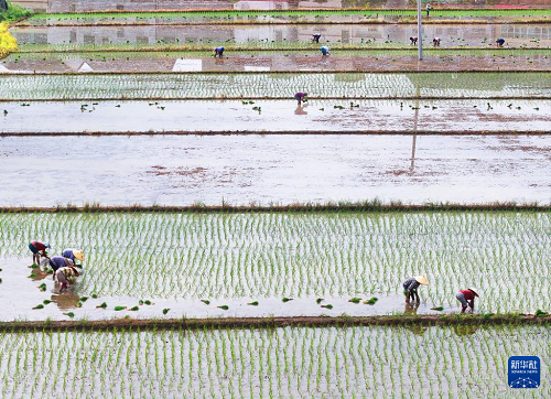 7月13日,湖南省衡陽(yáng)市衡東縣霞流鎮(zhèn)農(nóng)民在搶插晚稻(無(wú)人機(jī)照片)。(新華社發(fā) 曹正平 攝)