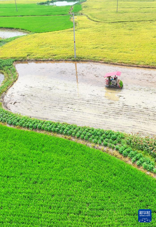 7月13日,湖南省衡陽(yáng)市衡東縣霞流鎮(zhèn)農(nóng)民駕駛農(nóng)機(jī)進(jìn)行晚稻插秧工作(無(wú)人機(jī)照片)。(新華社發(fā) 曹正平 攝)