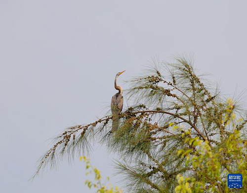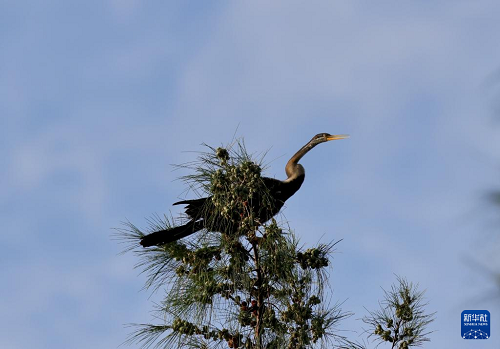 這是7月12日在海南昌江海尾國家濕地公園拍攝的黑腹蛇鵜。(新華社發(fā) 薛美麗 攝)