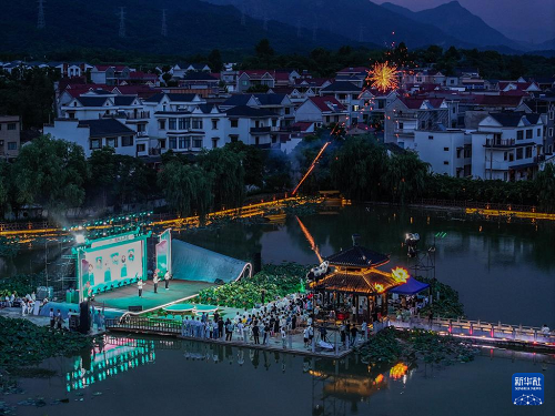 這是建德市大慈巖鎮(zhèn)的荷花節(jié)演出現(xiàn)場(chǎng)(7月17日攝,無人機(jī)照片)。(新華社記者 徐昱 攝)