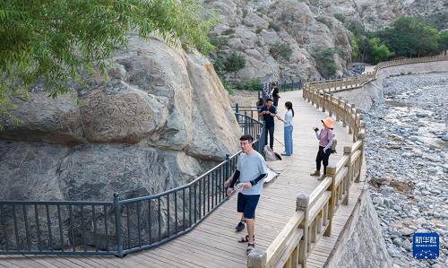 7月23日,游客在賀蘭山巖畫景區(qū)游覽(無人機(jī)照片)。(新華社記者 楊植森 攝)