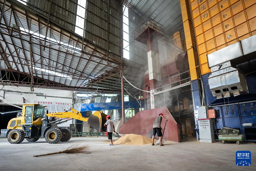 7月24日,在常德市鼎城區(qū)雙橋坪鎮(zhèn)一個水稻烘干工廠,工人把稻谷放入烘干設(shè)備。(新華社記者 陳思汗 攝)
