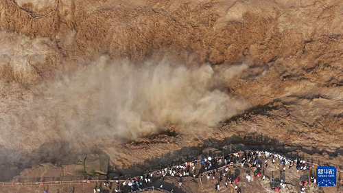 7月27日,人們在山西吉縣觀看黃河壺口瀑布(無人機照片)。(新華社發(fā) 劉宏達 攝)
