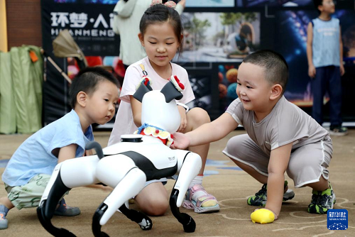 8月3日,山東省東營(yíng)市的小朋友在AI智能機(jī)器人科普展上與智能機(jī)器人互動(dòng)。(新華社發(fā) 劉智峰 攝)